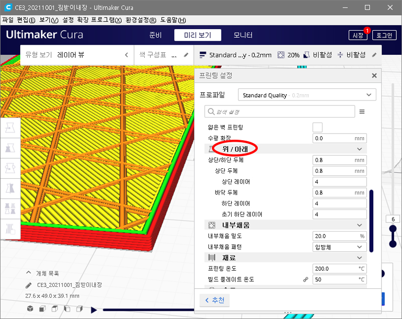 즉 상단/하단 두께를 0.8mm라고 하면 층 높이 0.2mm이므로 4층이 되는 것입니다.