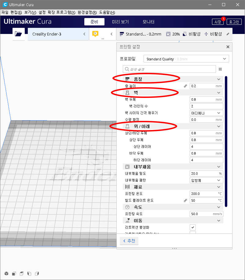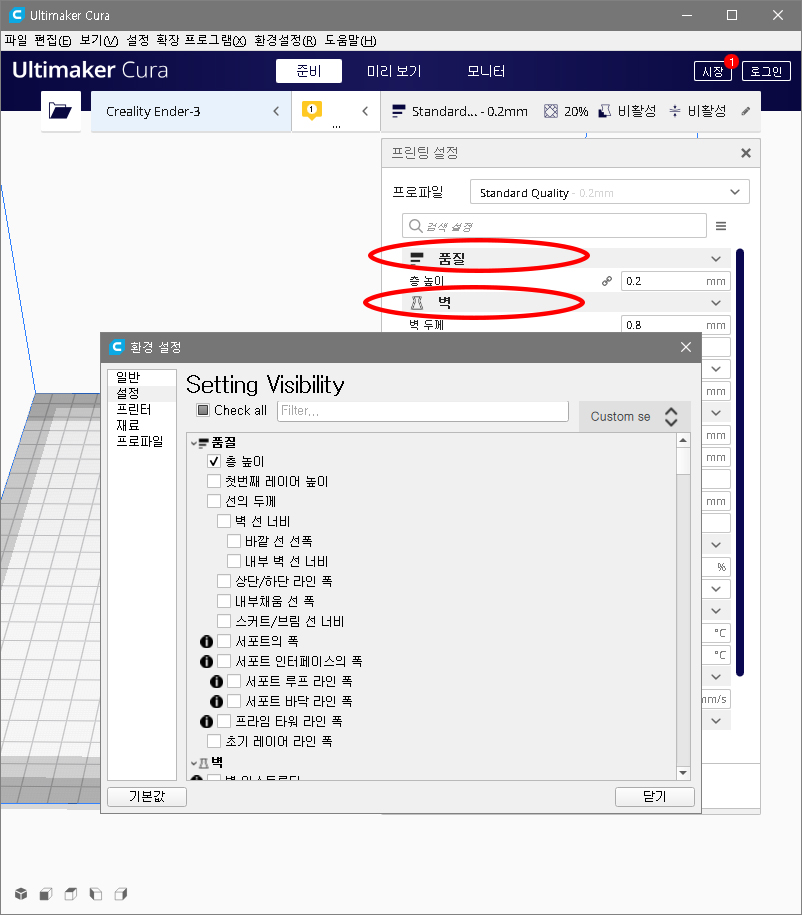 3D 프린팅 파일을 생성하려면, 세부적인 설정을 해야하는데, 이러한 설정들이 보이지 않습니다.