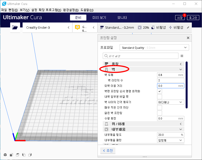 벽의 두께는 대부분 '품질' 옵션 설정 항목에서 선의 두께의 배수로 설정합니다.